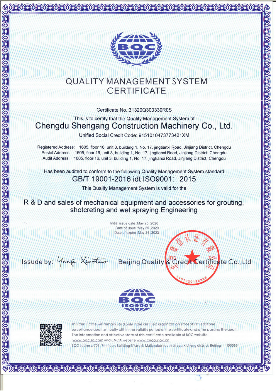 經過國家權威機構質量認證中心專家組的全面、嚴格、細致的指導和審核,確認成都申港工程機械有限公司質量管理體系符合GB/T19001-2016 idt ISO9001:2015標準,并于2020年5月25日向我公司正式頒發了ISO9001質量管理體系認證。